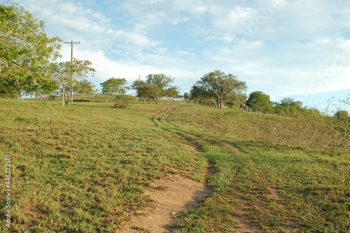 Rural road cutting through green grass plantation under rural blue sky, grass texture. Beautiful morning light on green grass farm