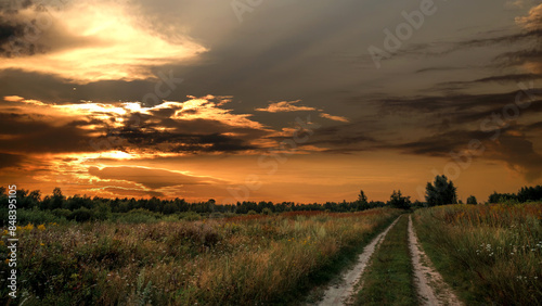 Rural road in a field against the backdrop of a summer sunset.