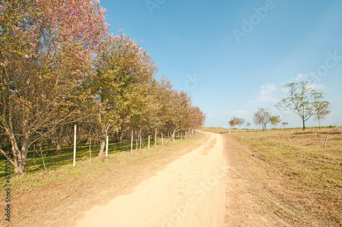 Rural road through green fields with mountain and blue sky, Thai