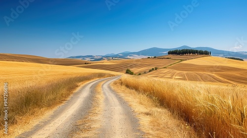 Rural Road Winding Through Golden Hills and Fields