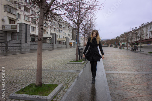 Russia, Novorossiysk - 03/26/2017: A girl walks around the city of Novorossiysk. Early morning.