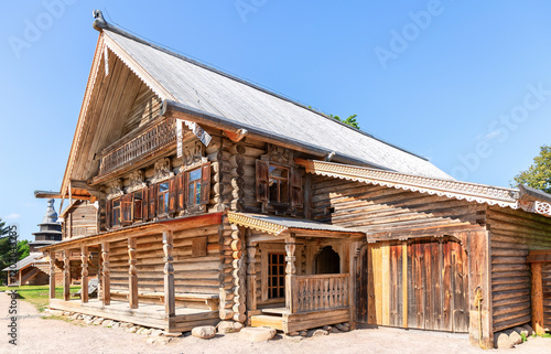 Russian folk traditional wooden architecture. Old wooden house with decorative carving at the russian Vitoslavlitsy village