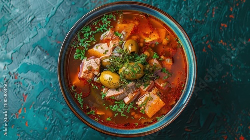 Russian solyanka soup with pickles olives and meats well-framed on teal backdrop