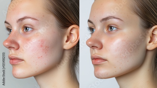 Russian woman's before-and-after photo shows skincare product effects, reducing redness and blemishes for clear, smooth skin
