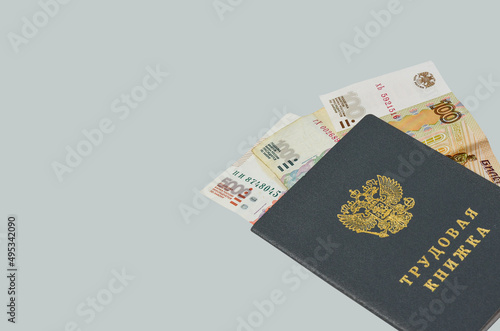 Russian work book and paper banknotes money, the concept of registration of cash benefits for unemployment, joining the labor exchange, getting a job
