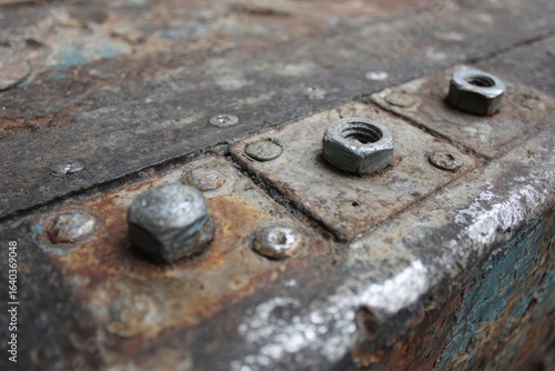 Rusted metal bolts on aged wood, outdoor close-up