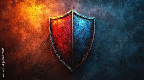 Rusted metal shield, half red, half blue, on dark background with dramatic lighting.