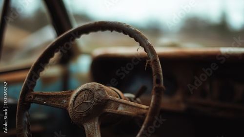 rusted steering wheel inside abandoned car interior with dashboard atmosphere evoking nostalgia concept of automotive salvage vintage restoration