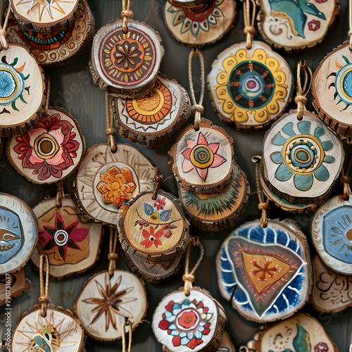 Rustic 3D wood slices, painted with boho symbols and hung as ornaments. Seamless Pattern, Fabric Pattern, Tumbler Wrap, Mug Wrap.