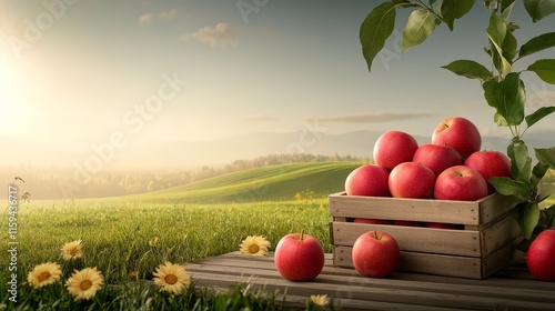 Rustic Apple Harvest in a Sunny Meadow - Sunlit apples in a wooden crate, symbolizing harvest, abundance, nature, freshness, and rural life.