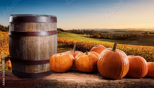 rustic autumn barrel with pumpkins overlooking scenic fields
