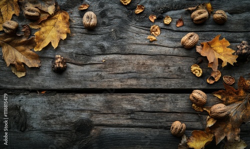 rustic autumn flat lay with walnuts leaves on aged wooden background warm seasonal composition