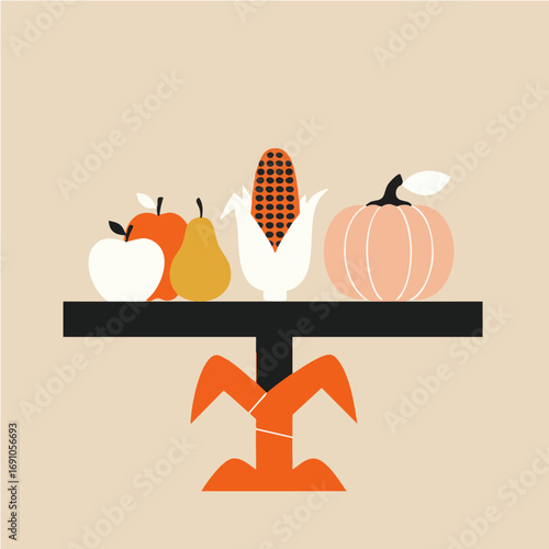 Rustic Autumn Table with Fresh Apples Pear Corn and Pumpkin