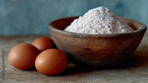 Rustic baking elements with eggs and flour in a wooden bowl for culinary inspiration