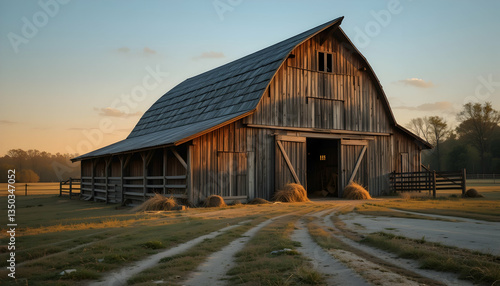 Rustic barn at sunrise evokes nostalgia for simpler times in the countryside peaceful setting