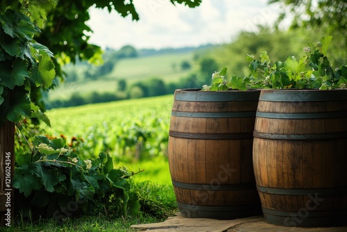 Rustic barrels surrounded by lush greenery on a farm scenic landscape photography nature’s serenity outdoor viewpoint wine country concept