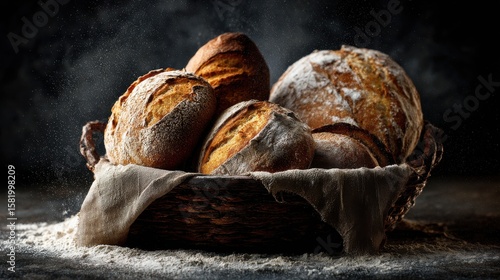 Rustic basket filled with assorted freshly baked artisanal bread loaves sprinkled with flour on dark moody background ideal for bakery visuals, culinary branding and food photography