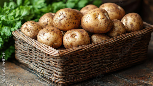 Rustic basket of freshly harvested organic potatoes with earthy tones in a farmhouse kitchen. Natural food ingredients ready for cooking, healthy farm-to-table produce, close-up view