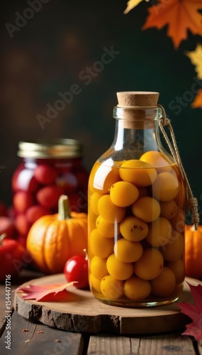 Rustic bottle, jarred pickles, autumn harvest setting, fermented, country, clear