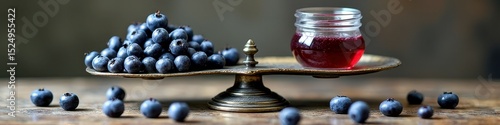 Rustic brass scale with fresh blueberries and red jam on wooden table