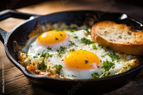 Rustic Breakfast Scene with Sizzling Bacon and Eggs in Cast Iron Skillet on Wooden Table
