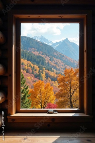 Rustic cabin window, breathtaking fall foliage panorama, shadow, rustic