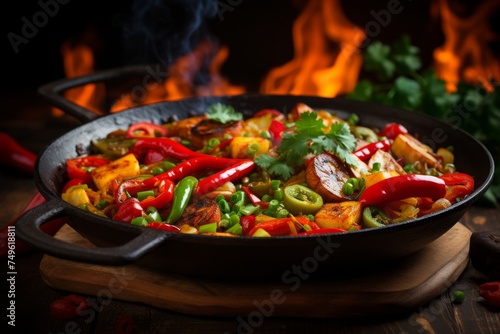 Rustic Cast Iron Pan Sizzling with Colorful Roasted Vegetables over Open Fire, Featuring Eggplant, Zucchini, Bell Peppers, Onions, and Cherry Tomatoes, Perfect for Outdoor Cooking and Campfire Feasts.