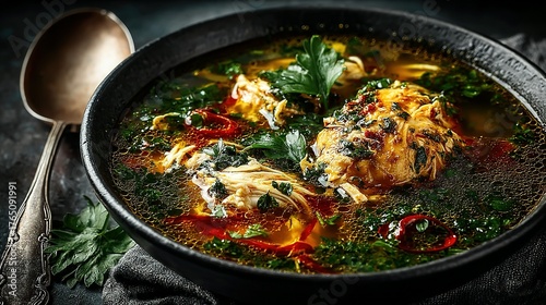 Rustic Chicken Soup with Herbs and Chili in Black Bowl, Moody Lighting