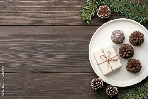 Rustic Christmas Flatlay Gift Treats Pine Cones Wooden Background