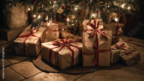 Rustic Christmas gifts wrapped in brown paper tied with red twine under glowing pine tree lights