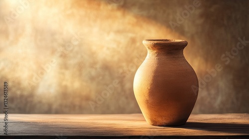 Rustic Clay Jug on Wooden Table with Warm Background Lighting