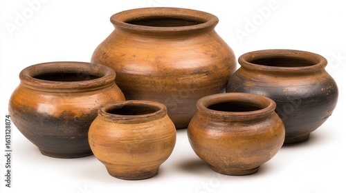 Rustic clay pots in various sizes showcase organic shapes and earthy tones, perfect for home decor, gardening, or culinary uses, Ideal for creative projects, cultural themes, or artisan crafts,