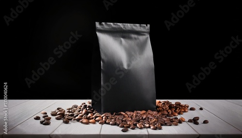 Rustic Coffee Elegance Dramatic Coffee Spill Enhances Sleek Black Packaging Mockup Amidst a Cozy Coffee Table Setting, Evoking a Charming, Intimate Atmosphere.