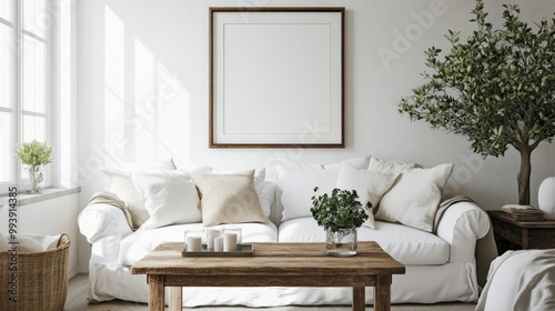 Rustic coffee table near white sofa against wall with art frame Farmhouse interior design of modern living room