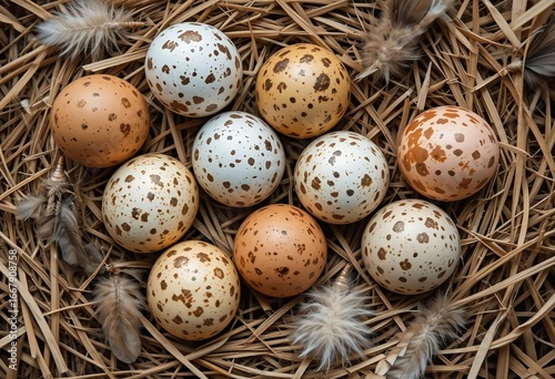 Rustic composition of quail eggs, feathers and straw, soft natural colors, sharp lines.