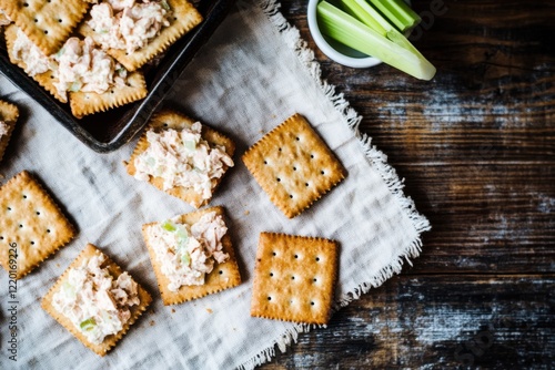 Rustic cracker sandwiches with tuna salad and crunchy celery on linen napkin