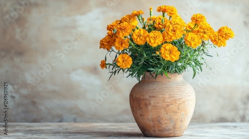 Rustic earthenware vase with vibrant orange marigolds on wooden table.