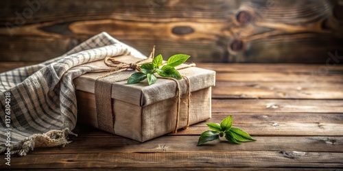Rustic Elegance A Gift Wrapped in Natural Fabric with Delicate Greenery on a Weathered Wooden Surface