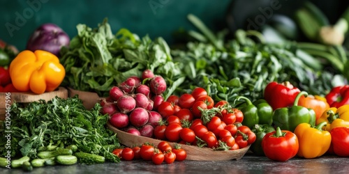 Rustic Farm-to-Table Produce Display Vibrant Peppers, Lush Greens and Radishes in Wooden Bowls - Fresh Market Visuals and Organic Culinary Branding