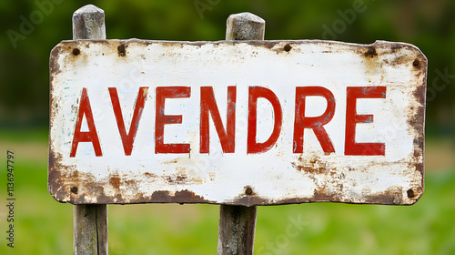 Rustic French "A Vendre" (For Sale) sign on weathered wood posts against a blurred green background. Perfect for real estate, rural, or vintage themes.