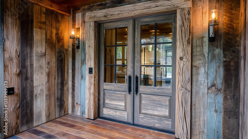 Rustic front door featuring glass encased in reclaimed wood blending heritage charm with sustainable design