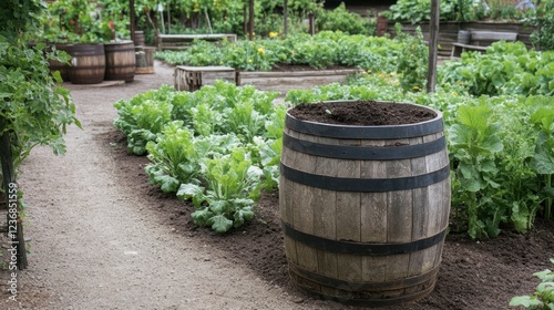 Rustic Garden Charm: Wooden Barrel Planter Amidst Lush Greens