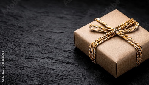 Rustic gift box with golden ribbon on a dark stone surface, perfect for special occasions.