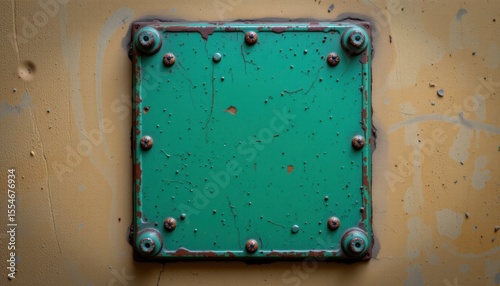 Rustic Green Metal Plate on Weathered Yellow Wall