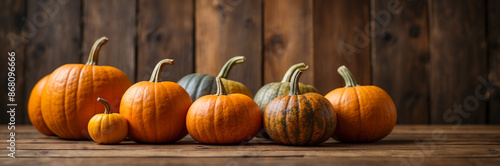 Rustic Harvest: Pumpkins Rest on a Weathered Wood Backdrop