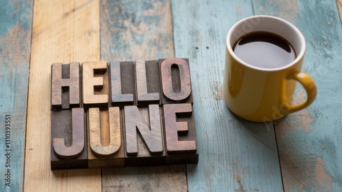 Rustic 'Hello June' Letterpress Blocks with Coffee Mug Generative AI