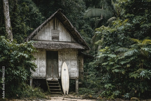 Rustic hut in lush jungle, surfboard leaning against the structure