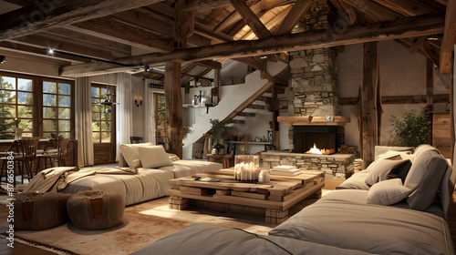Rustic Interior Design. Cozy Cabin Living Room with Wooden Beams, Stone Fireplace, and Earthy Tones