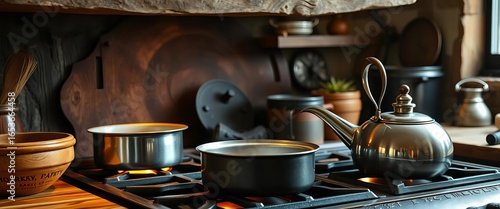 Rustic kitchen, cast iron stove's warm glow on simmering pot, vintage kettle Cozy atmosphere, iron, autumn