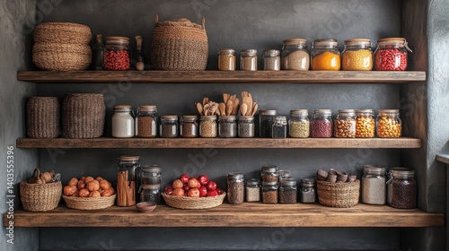 Rustic Kitchen Pantry with Glass Jars and Baskets